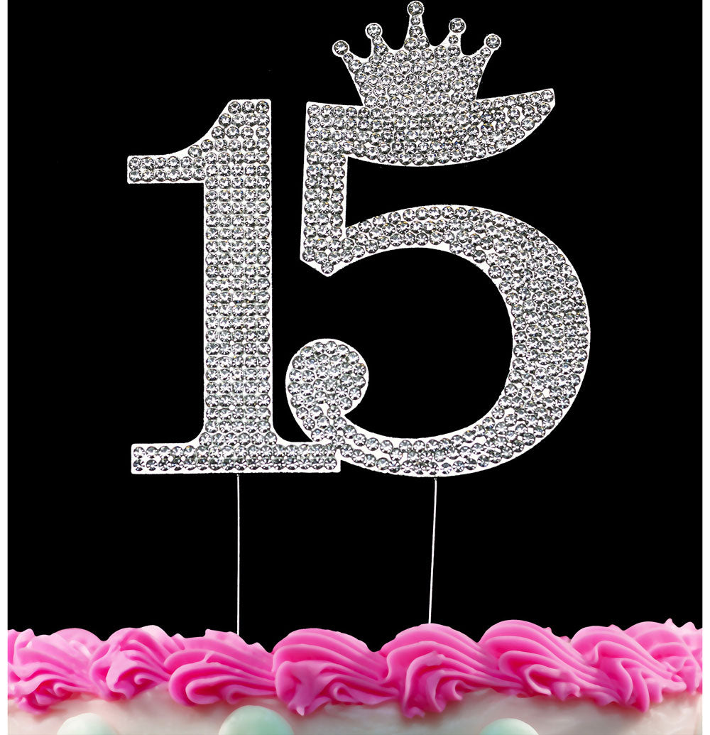 Crystal Number 15 with princess crown cake topper Silver or Gold color.